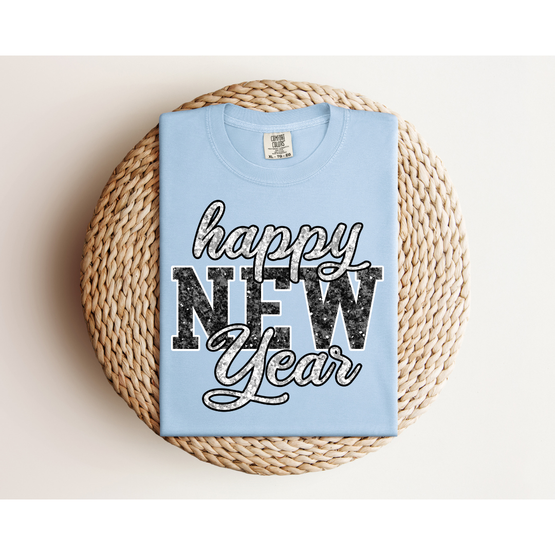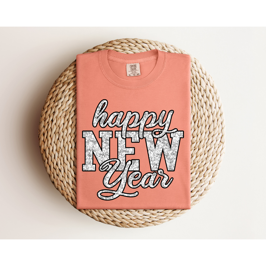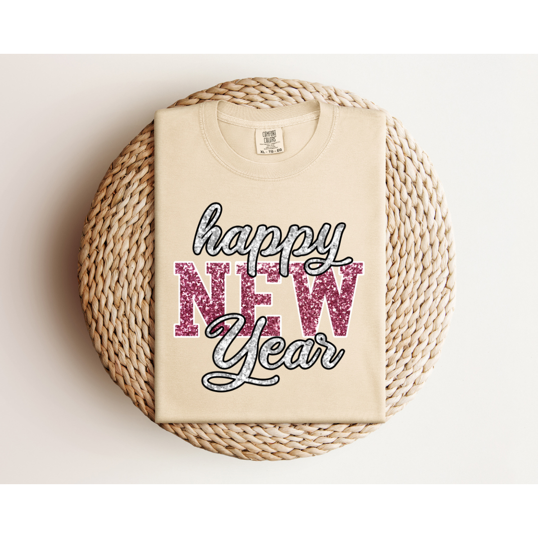 Glitter Happy New Year Design. The Comfort Colors T-Shirts are 100% pre-shrunk cotton with a slightly thicker material but extreme softness and comfort. The Comfort Colors Sweatshirts are 80% cotton, 20% polyester.